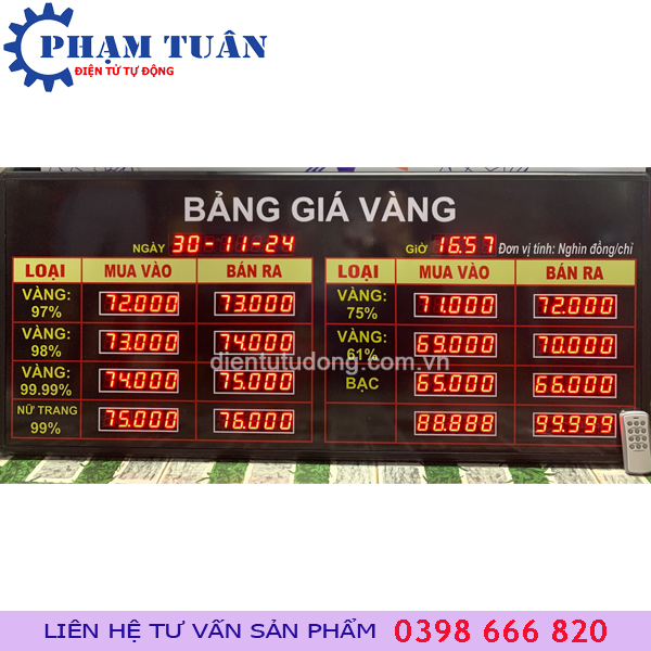 Bảng giá vàng hay gọi là bảng led giá vàng, bảng giá tiệm vàng , bảng tỷ giá vàng ,hiển thị thông tin bằng đèn led 7 đoạn , thể hiện giá cả các loại vàng mua vào và bán ra trên thị trường như 999.9, 99.5, 95.0, 750,680,610,416...., tùy theo mục đích sử dụng.